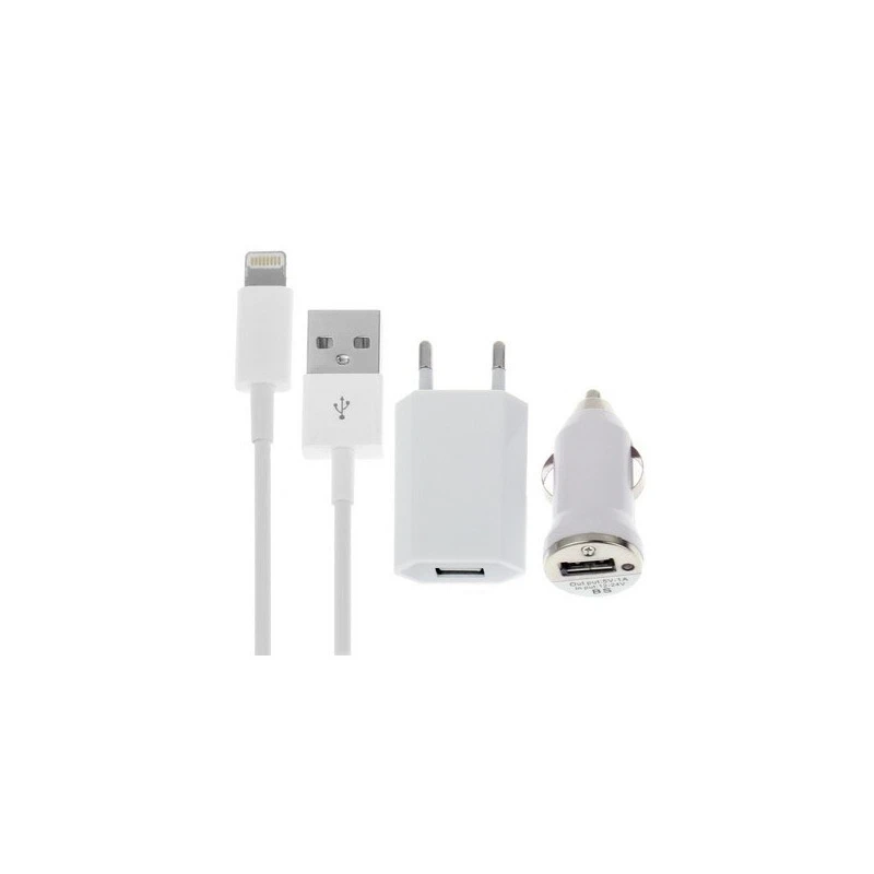Kit de recharge pour iPhone 5 contenant un adaptateur voiture allume-cigare, un adaptateur secteur ainsi qu’un câble lightning.